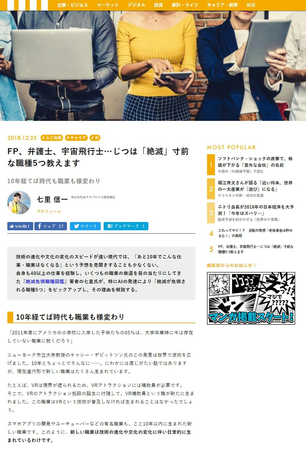 「マネー現代」にて、『絶滅危惧職種図鑑』に関して掲載いただきました。