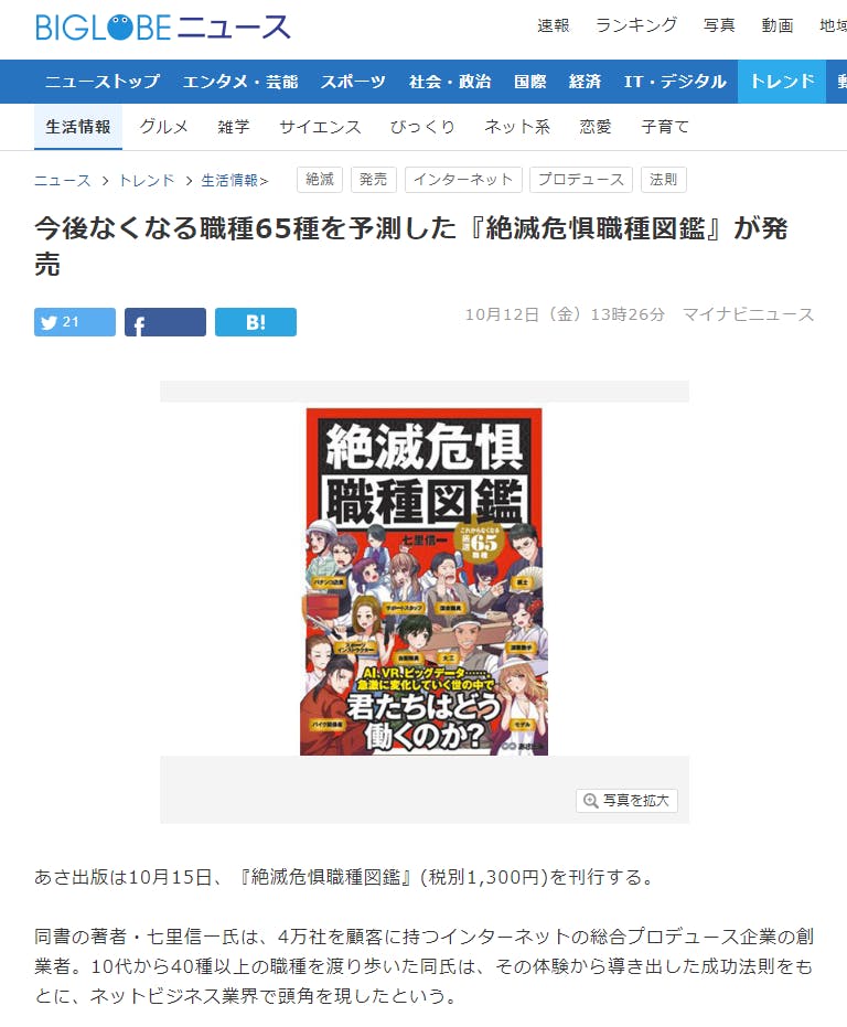 「BIGLOBEニュース」にて、『絶滅危惧職種図鑑』に関して掲載いただきました。